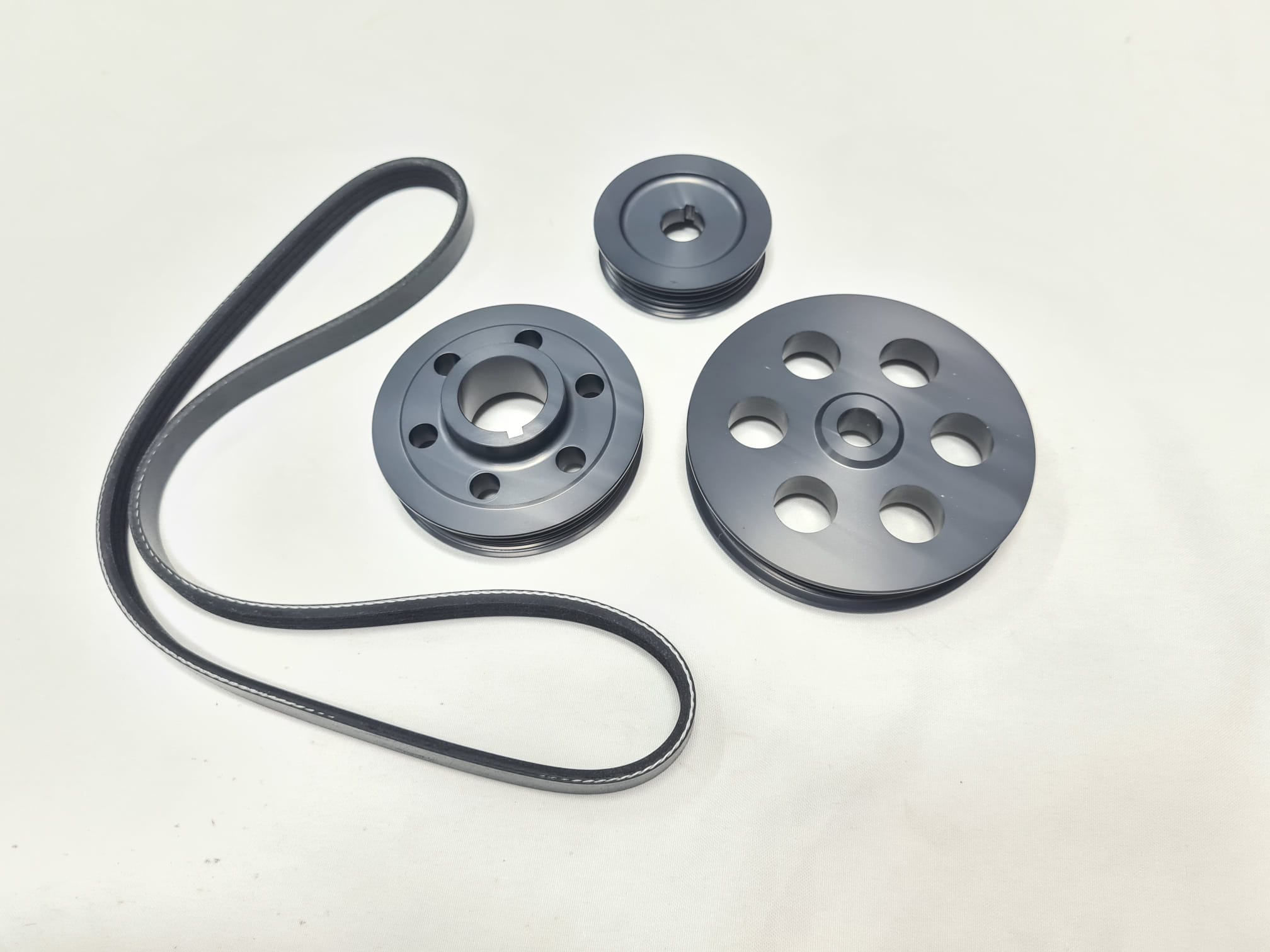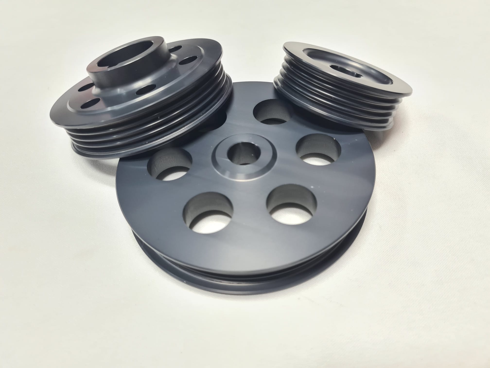 Ribbed pulleys are made from a quality aircraft aluminum and then anodize in gray color.